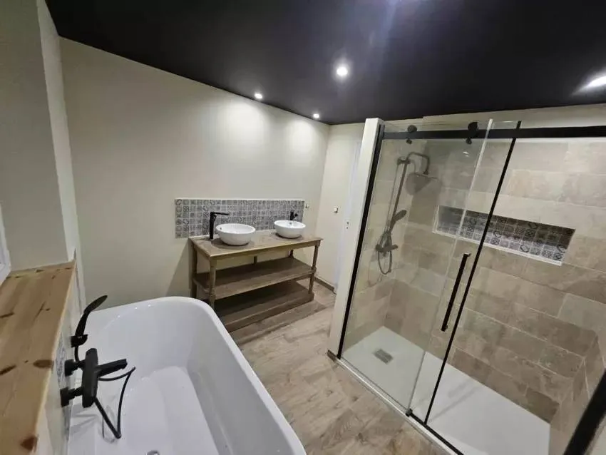 Le chantier concernait une pièce d’eau dotée d’une douche à l’italienne, d’une baignoire îlot, d’un plafond bas et d’un double vasque en bois naturel. La mission de Elite Peinture a consisté à reprendre intégralement les murs, les plafonds et les encadrements, avec une peinture résistante à la condensation et facile d’entretien.